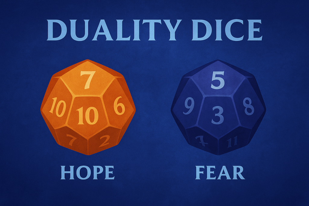 - Duality Dice (Hope & Fear) Daggerheart uses a distinctive dice system for actions. Whenever you attempt something challenging, you roll two 12-sided dice – one Hope die and one Fear die. You add them together (plus any trait or situational modifiers) to see if you meet the difficulty. However, the twist is which die is higher can matter. If the Hope die rolls higher, your action not only succeeds (if the total meets the difficulty) but you also gain a Hope token as a little boost of good fortune. If the Fear die is higher, the action might still succeed on the total, but some complication or negative twist happens (the game master might get a Fear token to spend on making your life interesting!). And if both dice come up the same number (doubles), that’s a critical success – you do amazingly well, gain a Hope, and even clear some Stress. This Hope/Fear dynamic adds a fun narrative push-pull to every roll.